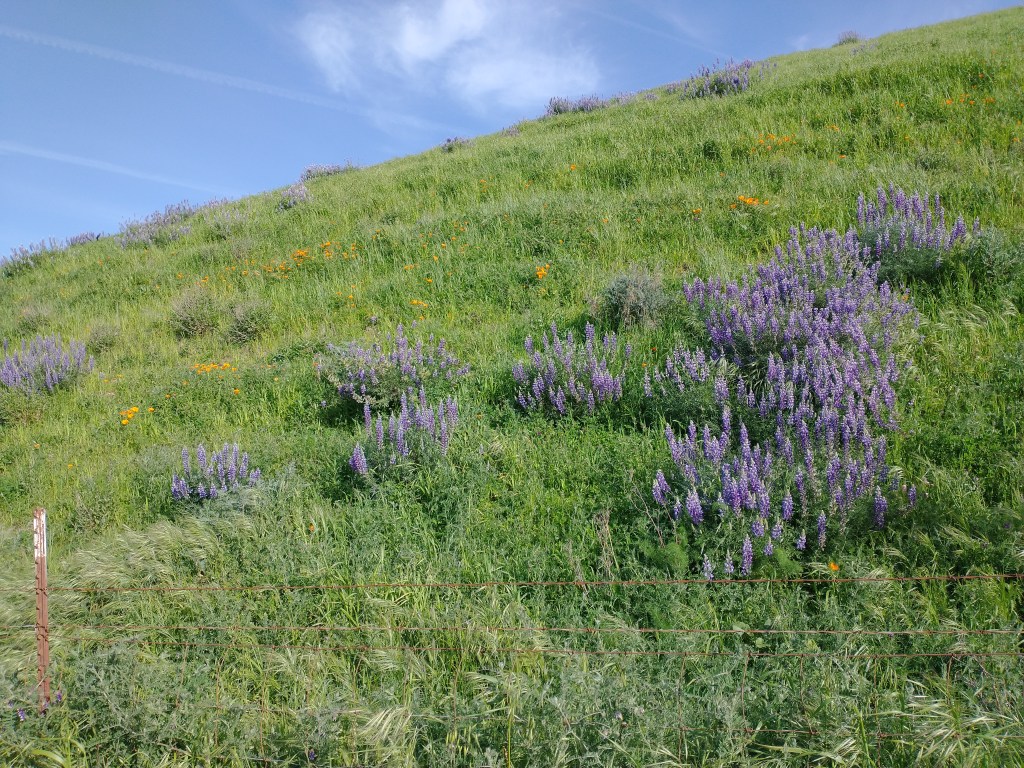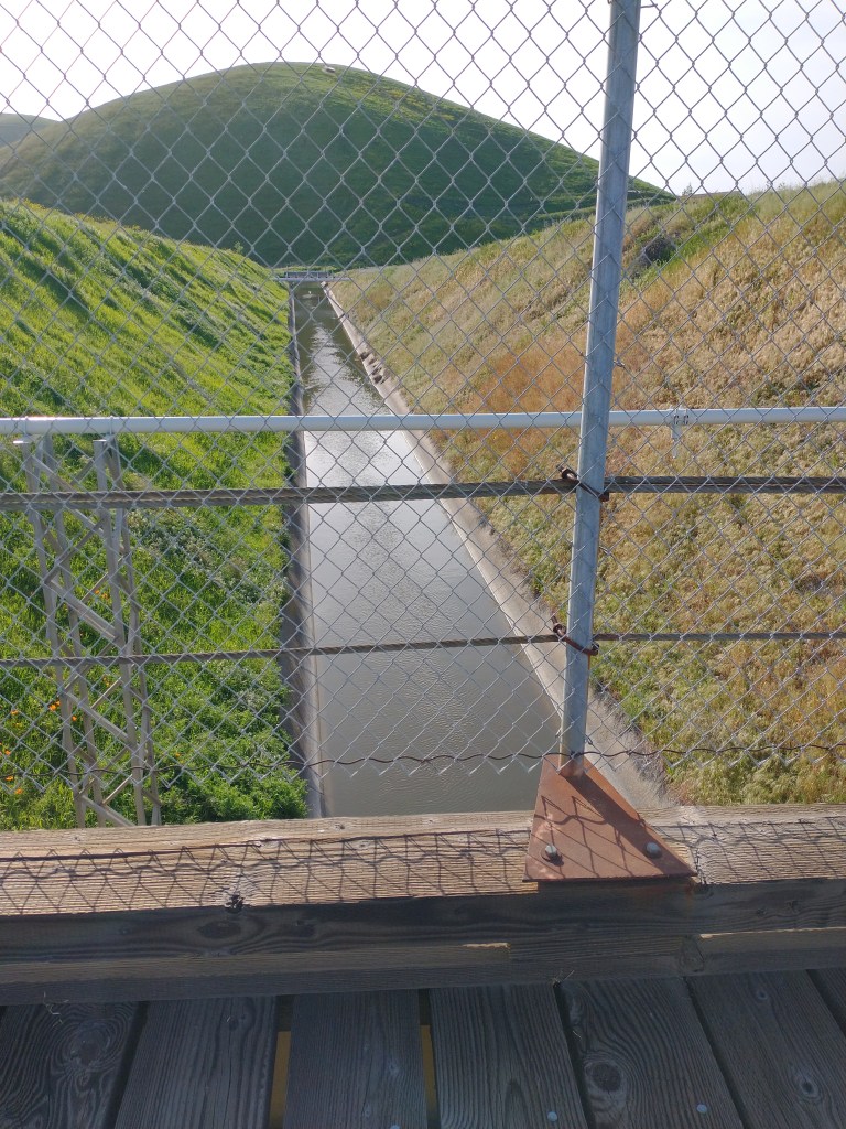 I started down a narrow asphalt road, pitted and decayed with age. It followed the Naval Weapons station fence. I passed over an old, but sturdy looking wooden bridge that spanned the canal and soon found myself surrounded by green globular hills covered in wildflowers.