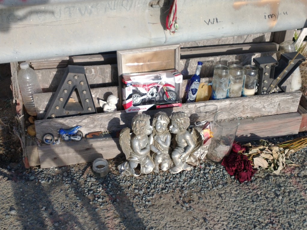 I’m guessing this memorial was for a dirt biker who frequented the area which is ripe with trails and dirt banks for jumps. I have to wonder if this person died doing what they love or if something else got them?