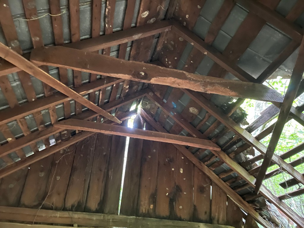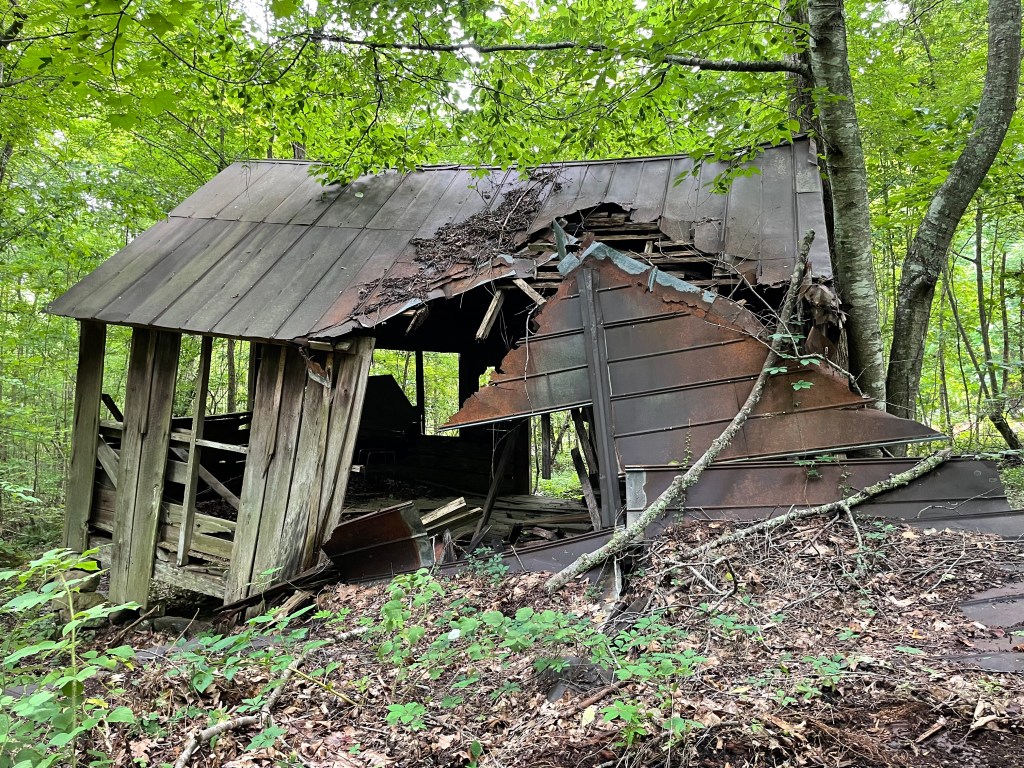 Anyway, last summer I spent a few hours getting a layer of about four inches of soil off the corrugated roof of the fallen portion and salvaging some of the panels that weren’t rusted through. I also started dreaming about salvaging some of the timbers and beams from this structure and using them to build my little dream cabin over on the acute triangle in the spot I’ve established as the best place.