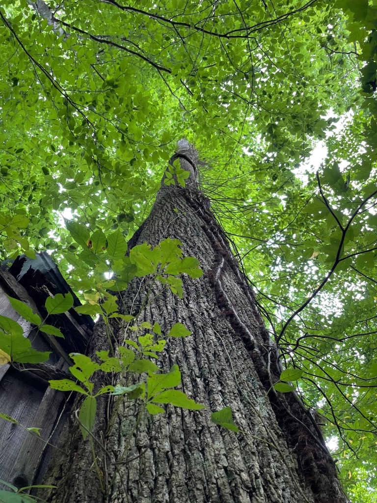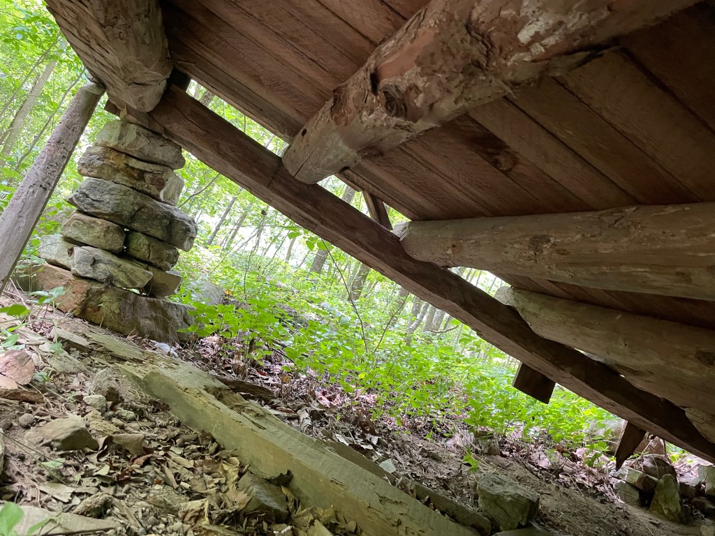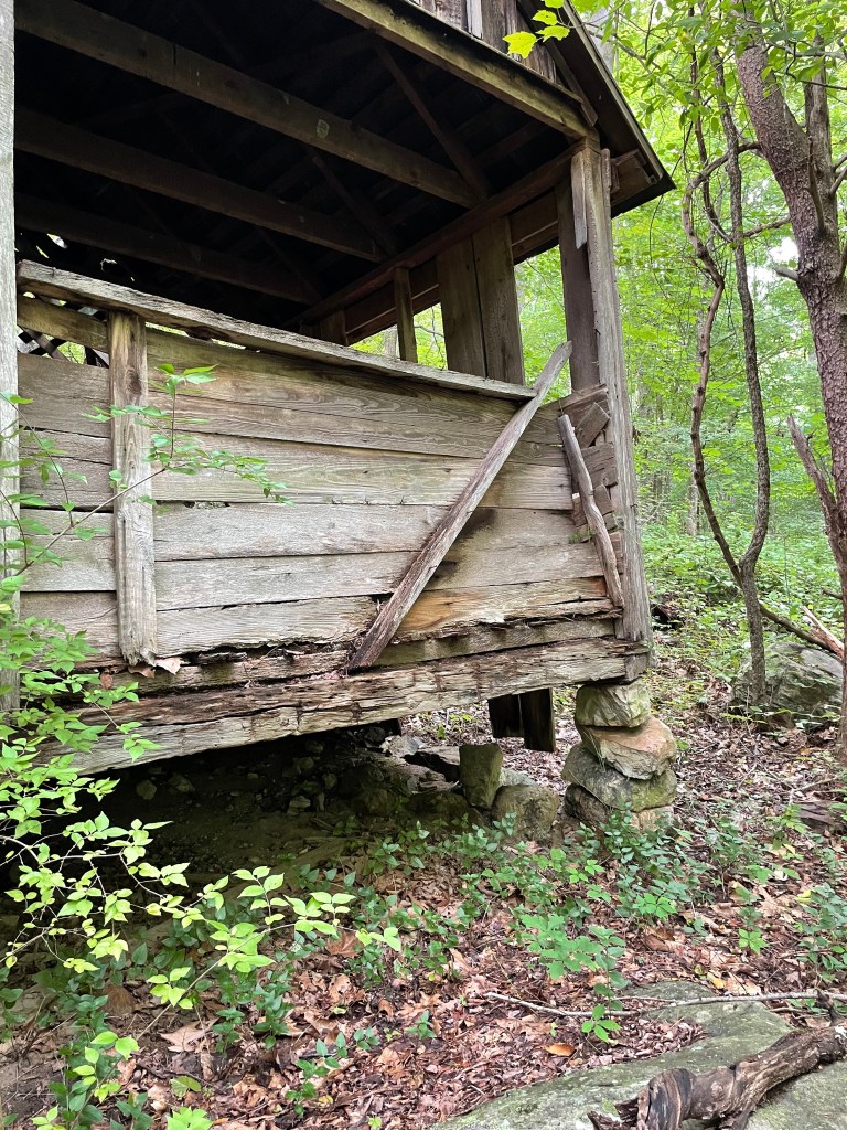 There is also the problem of how to get the roof down? I suppose I could harness myself to the massive Tulip Poplar that sits on one side and climb atop the cabin to disassemble. It would be better if I was harnessed to two trees opposite each other. If I lost my footing harnessed to just one, I’d likely scrape myself across the remaining structure and bash into the side of the tree.