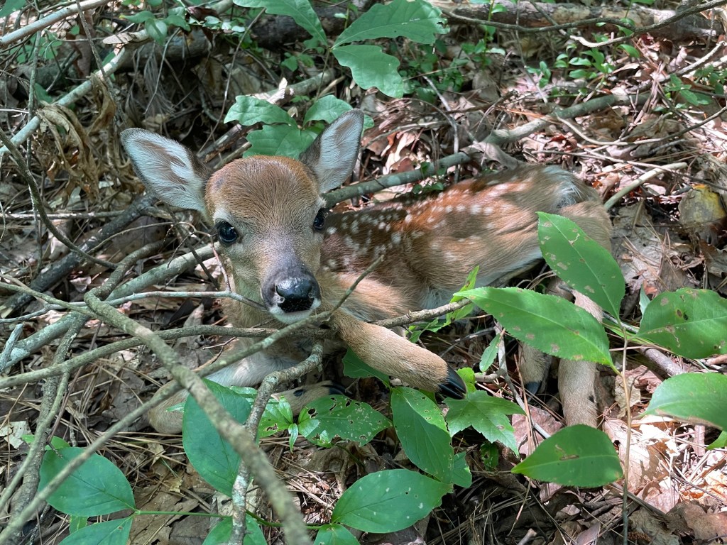 Intermittently I heard the sound repeated , “Vrip, Vrip”, moving higher up the knob. I saw the deer flash between trees. The sound kept rising but I had no interest in following it into the steep bramble. I turned around, got back on the trail and passed the spot where I’d find the baby the next day — the spot where I think the mama was trying to lead me away from.