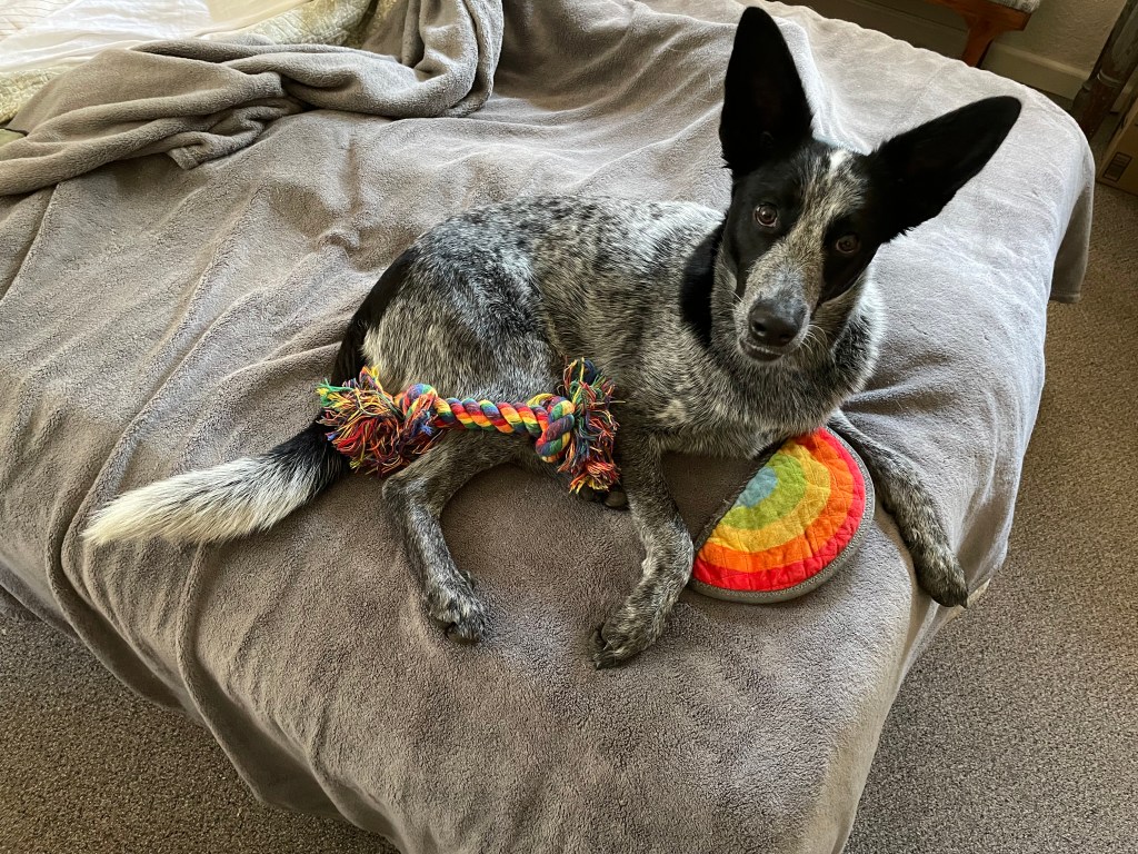Blue heelers have their one person and that is definitely Jillian. Despite the absolute ecstatic excitement I’m greeted with by Sasha, her fierce protective nature extends to me and is demonstrated whenever I pass through Jillian’s bedroom door. If I should want to talk to Jillian or visit her in her private space, Sasha leaps onto the bed, crouches and begins a fierce growl. I dare not approach with anything but caution. To get close I must offer up my arm to be bitten which she does with expert constraint that says watch it buddy. Someone intent on harm would come across a dog more like a tornado filled with nails and plate glass shards with powerful winds shifting in unpredictable directions.